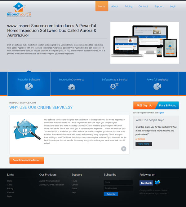What InspectSource provide: Our software services are designed from the bottom to the top with you, the Home Inspector, in mind! Both Aurora and Aurora2GO! have a systematic flow that helps you complete your inspections faster and more accurately. Aurora – Mobile was made to give you speed which will shave time off the time it now takes you to complete your inspection… Which will show on your “bottom line”! It is loaded on your iPad and can be used to complete your inspection from start to finish. Aurora – Web was also made with speed and accuracy being top priority! Give it a try you have nothing to lose! You’ll have 14 full days to try the complete software if you don’t think it’s the best Home inspection software for the money, simply discontinue your service and ask for a full refund!