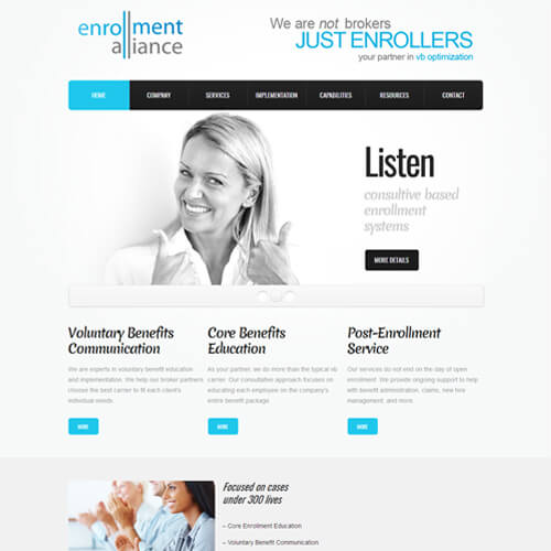 We are a 3rd party enrollment firm specializing in voluntary benefit consultation. We partner with brokers to help create an ideal enrollment atmosphere that fosters more desirable results. We build long-term partnerships designed to help our clients cut administrative time & costs as well as to increase revenues. Our company culture encourages the acceleration of technological resources. We foster creative solutions for more effective communication techniques. We take a consultative approach to the entire enrollment process. We listen closely to understand the challenges of employers, brokers, and individual policy holders. Our mission is to implement solutions at all levels of the enrollment process. Consultative approach to understand challenges and deliver results Provide all communication, enrollment and reporting services Offer a full menu of benefit administration services and capabilites Deliver exceptional service during and after the enrollment